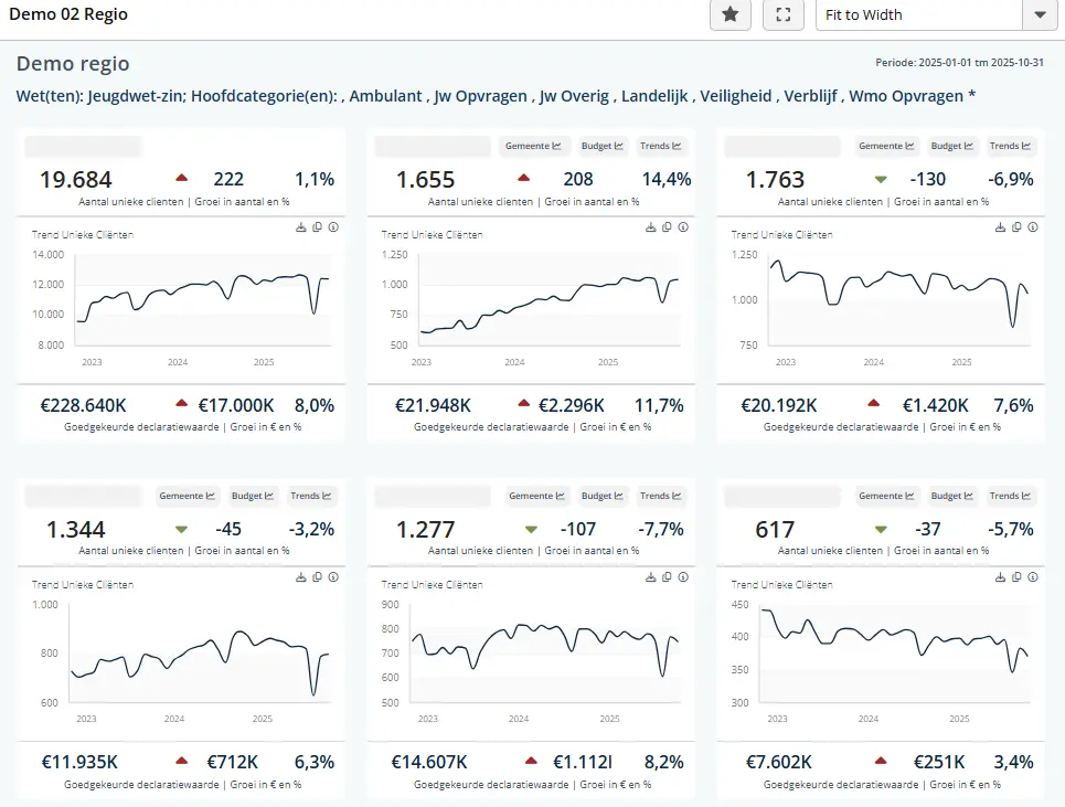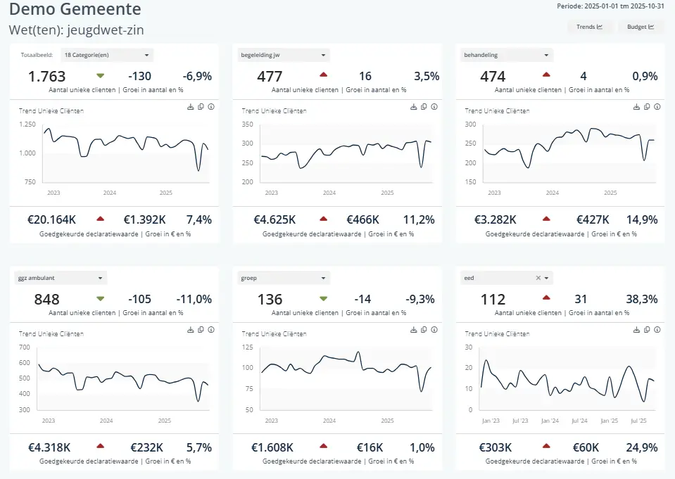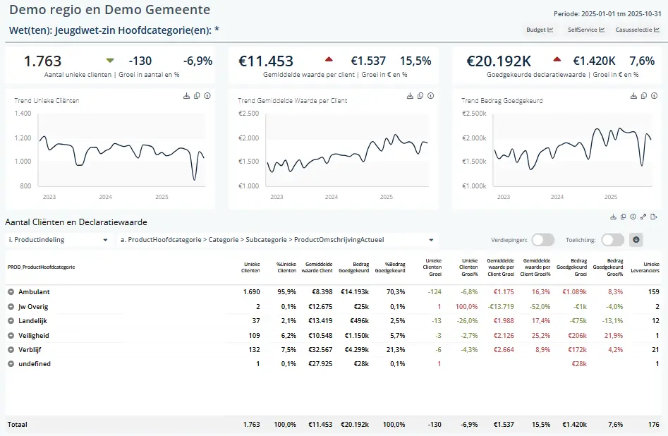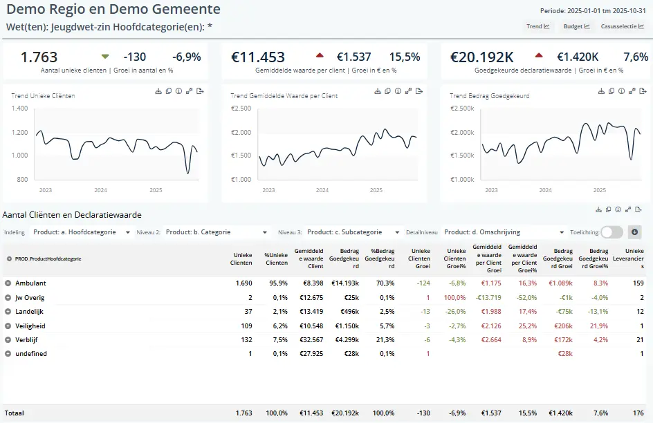 Het trendrapport toont de ontwikkeling in de tijd: hoe het aantal unieke cliënten, de gemiddelde kosten per cliënt en de totale declaratiewaarde zich door de tijd heen veranderen. Zo kun je groei en krimp vanuit verschillende perspectieven analyseren, bijvoorbeeld per productcategorie of per aanbieder. De gegevens zijn uitgewerkt op vier detailniveaus, waardoor je vanuit het totaalbeeld stap voor stap kunt inzoomen op de onderliggende details.