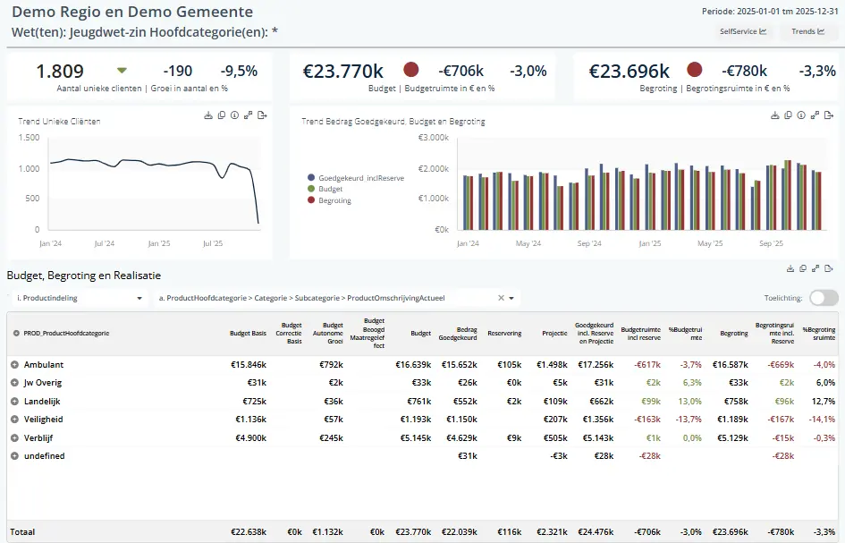 Het budgetrapport laat zien hoe de gerealiseerde kosten zich verhouden tot het beschikbare budget en de begroting, per gemeente en per productcategorie. Je kunt hier volgen of de uitgaven op koers liggen, welke onderdelen achterblijven of juist harder groeien dan voorzien en – met behulp van een eindejaarsprojectie – een inschatting maken van het verwachte resultaat aan het eind van het jaar, zodat tijdig kan worden bijgestuurd.